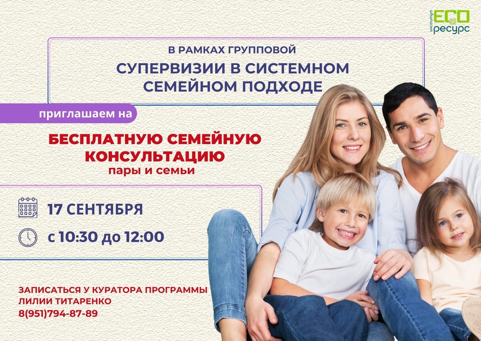 Приглашаем на БЕСПЛАТНУЮ СЕМЕЙНУЮ консультацию! Это отличный шанс получить квалифицированную помощь от профессионалов, семейных психологов, в самых сложных вопросах вашей семьи и сэкономить свой бюджет!